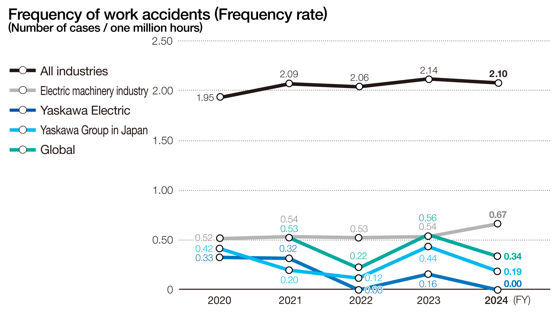 In FY2024, the LTIFR was 0.00 for Yaskawa Electric, 0.19 for the Yaskawa Group in Japan, and 0.34 for the Yaskawa Group overseas*. All three figures were improved from the previous year. As a result of our initiatives including workplace risk assessments, thorough implementation of recurrence prevention measures, and strengthened safety patrols, we have successfully reduced workplace accidents. We will continue our efforts to eliminate occupational accidents and further enhance our safety practices.